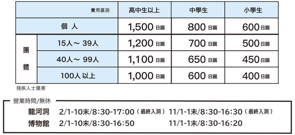 - 觀光行程費用 + 西本洞行程入場費1,000日元 + 西本洞管理費500日圓