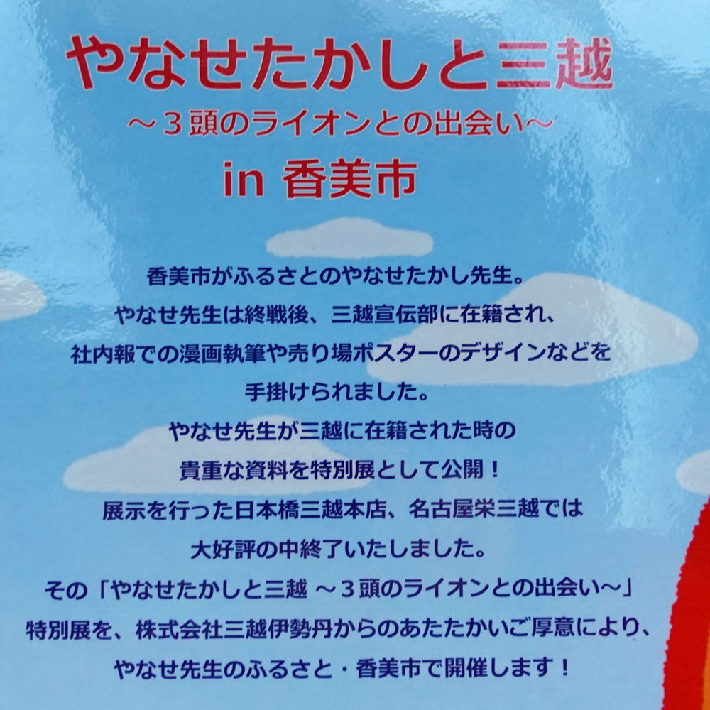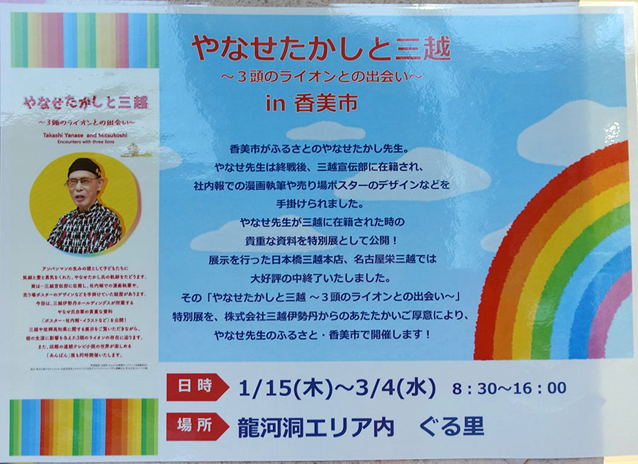 EVENT 「やなせたかしと三越」in香美市パネル展開催! 2026.01.15 2026年1月15日(木)~3月4日(水)の期間中、龍河洞商店街休憩所「ぐる里」にて、やなせたかしと三越~3頭のライオンとの出会い~in香美市のパネル展が開催中です。 やなせ先生が三越宣伝部に在籍していた時の資料などを特別に展示。是非お越しください。 TOP イベント&ニュース 「やなせたかしと三越」in香美市パネル展開催!